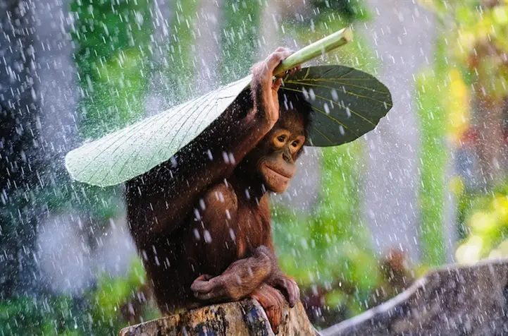 红毛猩猩用芭蕉叶避雨(Orangutan using a banana leaf to shield itself from the rain, Andrew Suryono )