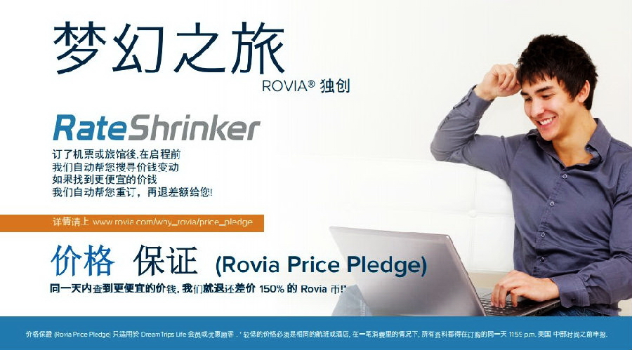 - 可在个人网站订购全球旅游配套、机票及酒店。订购均享受 最低价格保证(RoviaPrice Pledge),差额可赔付150%美元积分;
