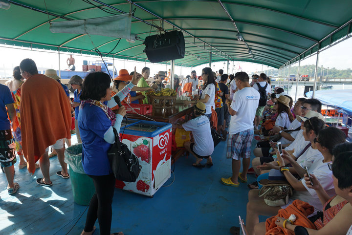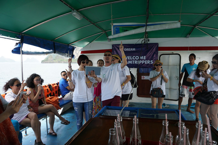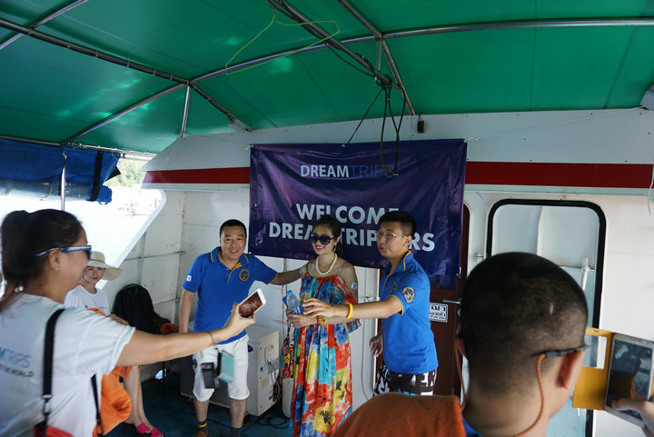 第二天一早出海的船上,大家载歌载舞,欢声笑语