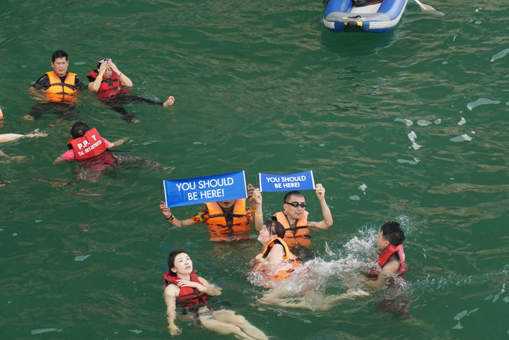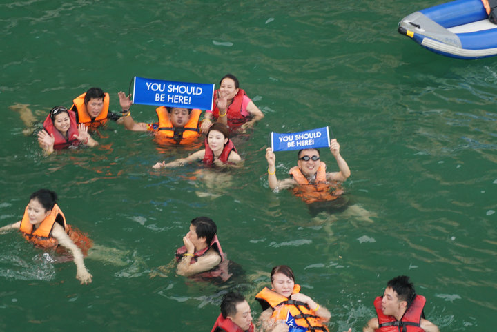 最嗨最挑战体力的游泳时间,看似平静实际波澜起伏的海面,让不少不熟水性的会员尝到了点“海带汤”,大家还是玩得很嗨,小蓝旗也在海面上不断展开