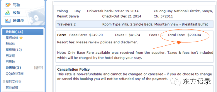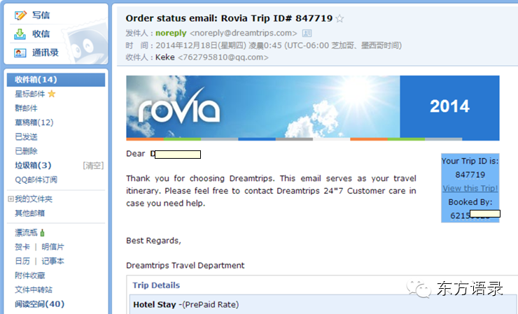 我在dreamtrips.com网站上订了12月19日--12月21日,两晚房间。邮箱就会收到公司发的订单。