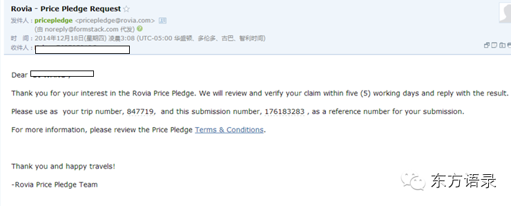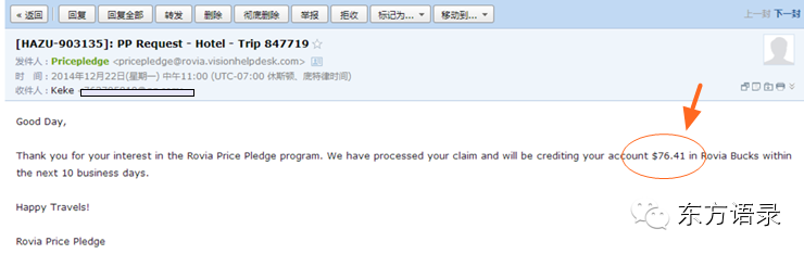 在12月 22日又收到公司的邮件,公司已经处理了,感谢你提交价格承诺表,将在10个工作日退回76.41美金到你的旅游账户里。