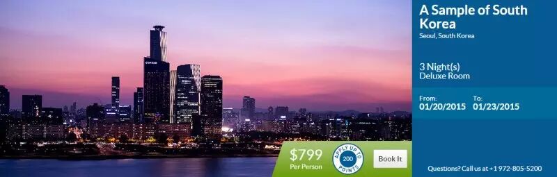 4天3晚在首尔康拉德,23-1汝矣岛洞,永登浦区首尔,150-945,韩国。电话:+82261377000的价格是每人2名成人每间客房。