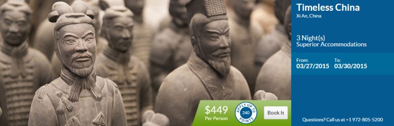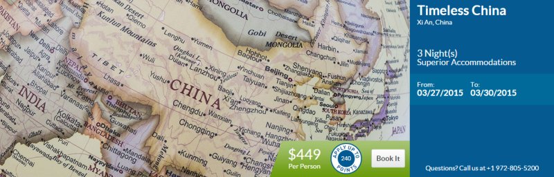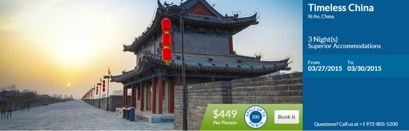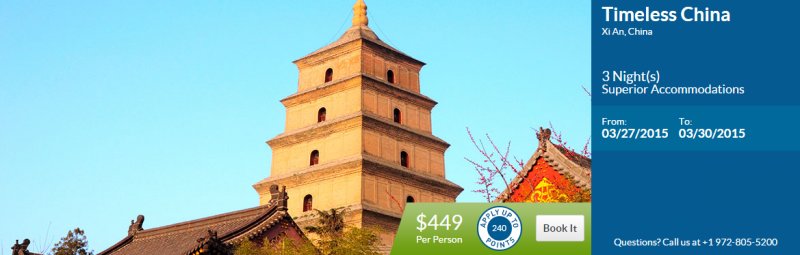 航空运输是不包括在内。最近的商业机场是西安咸阳国际机场(XIY)。参观DreamTrips.com并选择“预订其他旅游”选项卡购买机票。