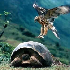 10.一只乌龟在沙滩上晒太阳,这时飞来一只老鹰,乌龟觉得自己有坚硬的壳,老鹰拿它没办法就有恃无恐。结果老鹰一爪子抓起了乌龟,飞到上千米的高空,在飞过一片岩石的时候狠狠的把乌龟摔了下来,乌龟连肠子都摔出来了。