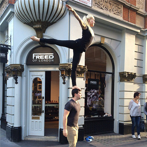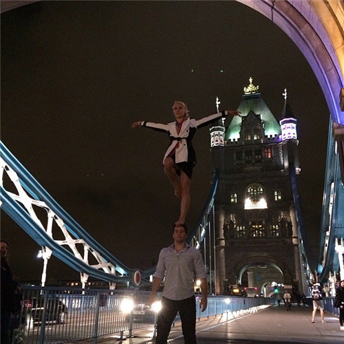 原来他们两个同是马戏团的表演艺术家,难怪拍这种照片对他们来说轻而易举,女生甚至打趣的说:“常有人在派对上要求我们表演,大家可以猜猜看有哪些照片我们是清醒或是喝醉的时候拍下。”