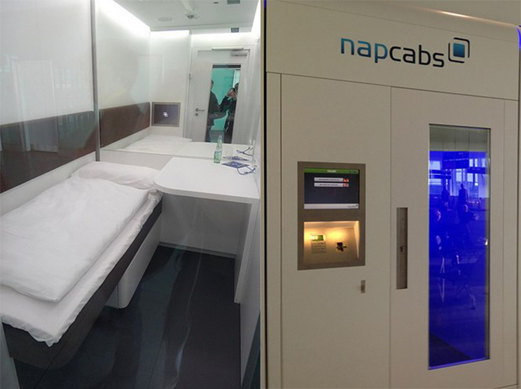Napcabs (小睡艙) 這個好東西要來拯救你滯留在機場的時光了。在這獨立的小空間裡頭,有Wifi、有小桌子、有充電座、有行李放置空間、還有鬧鐘,當然…還有床。